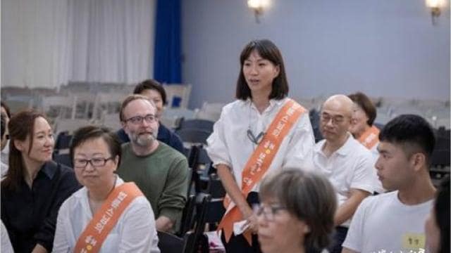 [Volunteering for the New Jersey Dharma Talk event in 2023, Aram Lee standing. To her left in the green sweater is her spouse]