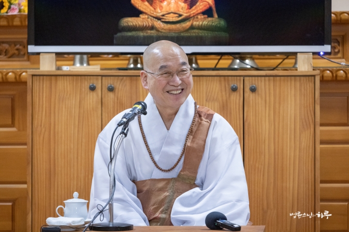 “It’s wonderful to see you all. I see many seniors, colleagues, and juniors here. Although I’ve known about the alumni meetings, I’ve never been able to attend, using my busy schedule as an excuse. Today, I had planned to visit Unmunsa Temple with some foreign guests, so I initially thought I’d just greet you briefly in the parking lot. However, looking at the schedule, I realized the Unmunsa visit wasn’t essential, so I changed my plans to attend this alumni Dharma meeting.
