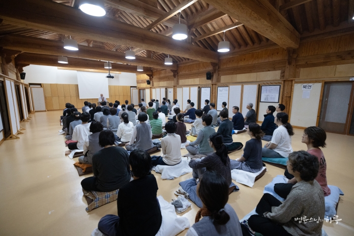 You’ve all tried meditation for five days, but if five days isn’t enough to realize this, you might need to sit still and meditate for about a year before you finally have the great realization that ‘there’s no problem even when I’m just sitting still.’ However, after just five days of meditation like this, there’s a high chance you’ll return to your old habits as soon as you leave. As soon as you go out, you’ll order jjajangmyeon, and starting tonight, you’ll work all night again. Because of this pattern, things always remain the same. Now, if you have any symptoms or questions that arose during meditation, please raise your hand and ask.”