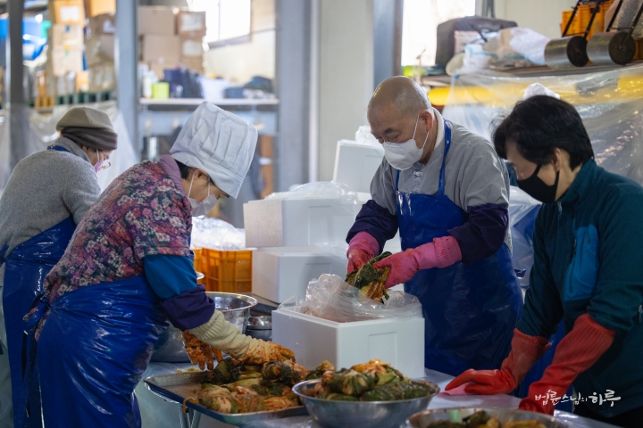 Following Sunim’s instructions, everyone kneaded the kimchi with great care, wrapped it neatly with outer leaves, and finished it tidily. As gift boxes steadily piled up, the sun had completely set before they knew it.