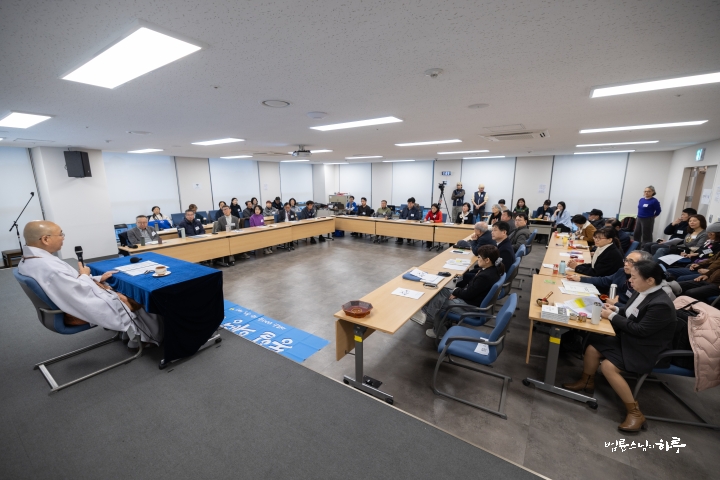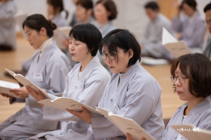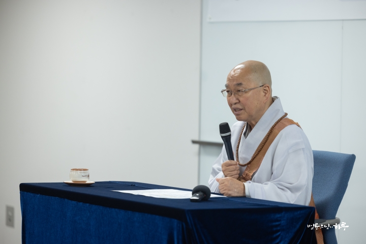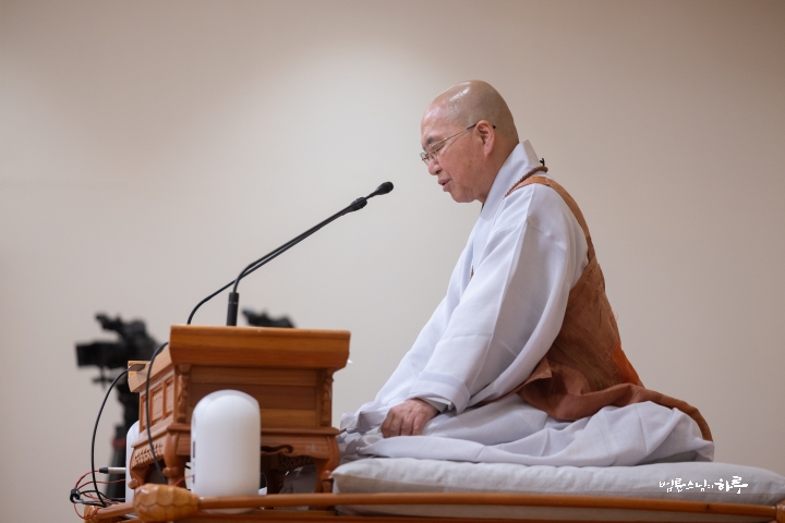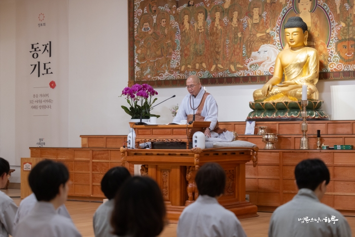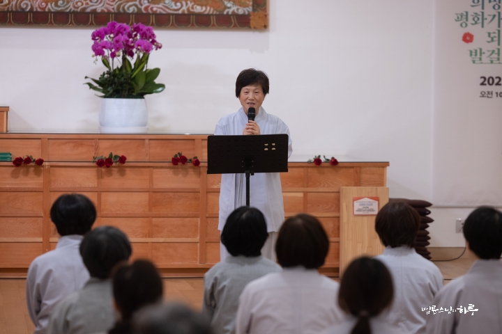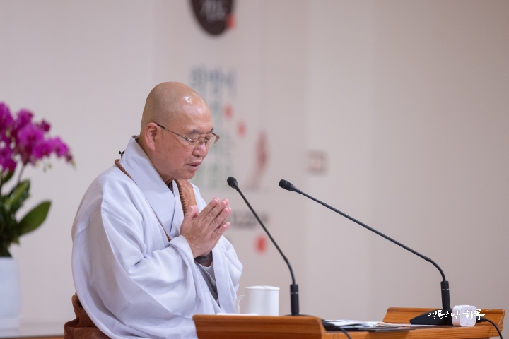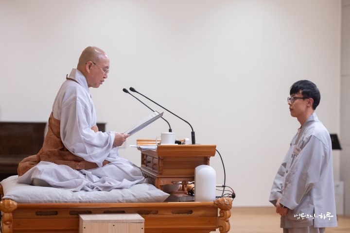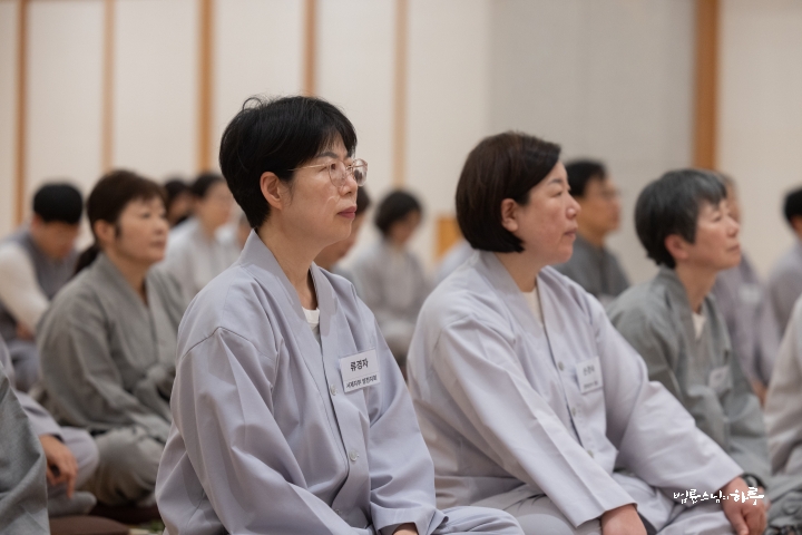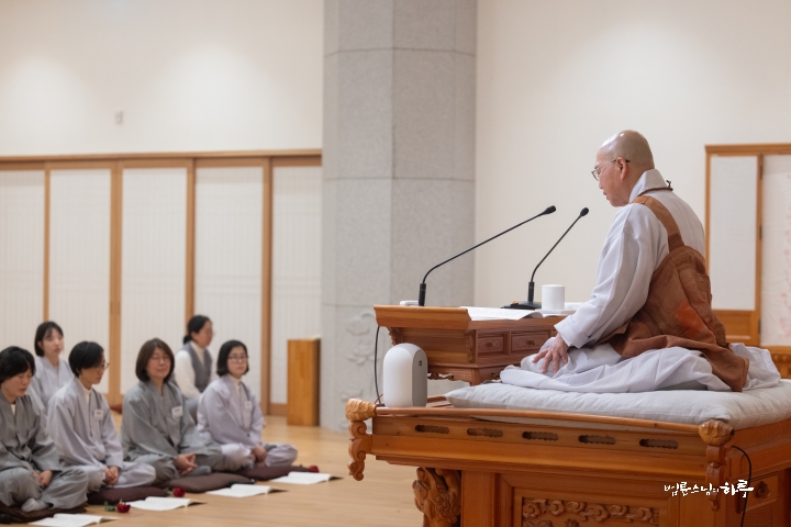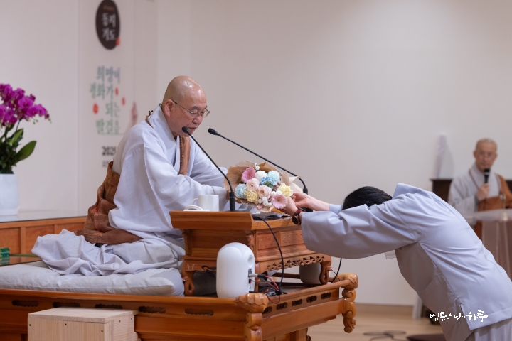 “Today at Jungto Society, we are holding the Seowon Practitioner Ordination Ceremony for those who have steadily practiced as Balsim Practitioners and have become exemplary members of the community. Since Seowon Practitioners will serve as leaders of the community in the future, they must fundamentally avoid causing harm to others and become people who alleviate others’ suffering or benefit others. To achieve this, the attitude they must maintain is: passively, not harming others, not causing loss to others, and not causing suffering to others. Actively, they must save others, benefit others, and bring joy to others. This is the fundamental attitude that Seowon Practitioners, who will become leaders among Jungto practitioners, must maintain.