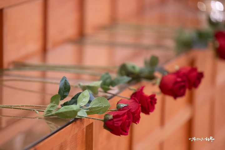 Sunim, who was officiating, took the stage first, and then the bride and groom entered as the wedding march played. After the couple exchanged their vows and the marriage was declared, they asked Sunim for his wedding address. Looking at the couple standing side by side, Sunim calmly advised them on the mindset needed for a happy married life.