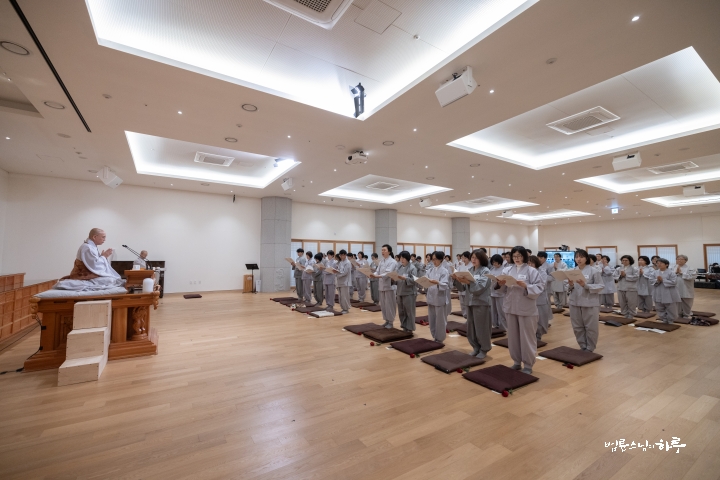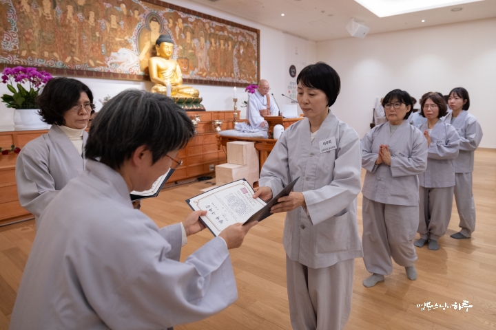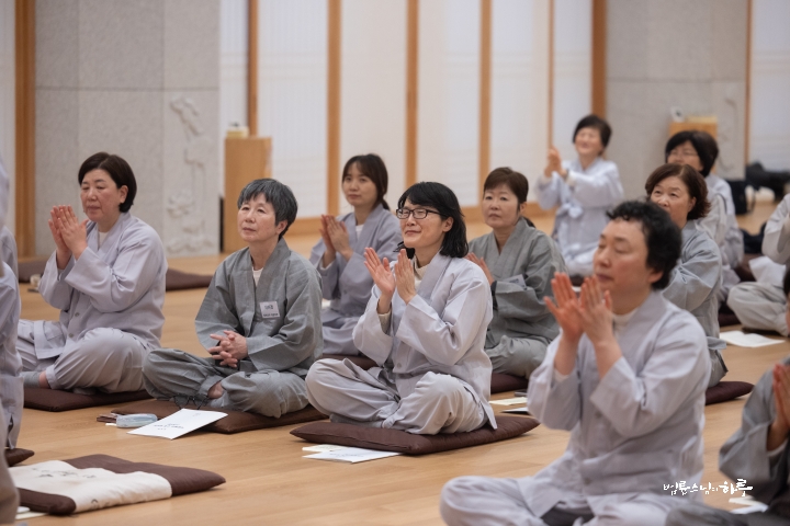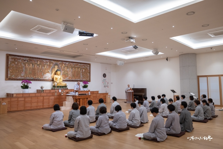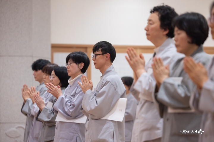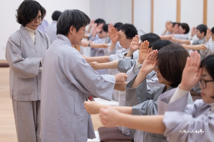 However, when we live in the secular world, it’s easy to buy luxury items when we can afford them, use expensive cosmetics, and purchase expensive designer goods. But when you become a Seowon Practitioner, you must live cleanly and frugally. This doesn’t mean ‘live in poverty’ or ‘live in a slovenly manner.’ It means that rather than adorning yourself with material things to show off, you should establish yourself through your mind and practice. Only by maintaining this attitude of frugal living, humble demeanor, and mental equanimity without getting carried away can you become a leader of the Sangha. To become a leader of the Sangha, you must be an example to others. Those of you receiving the Seowon Practitioner precepts today must keep this in mind.