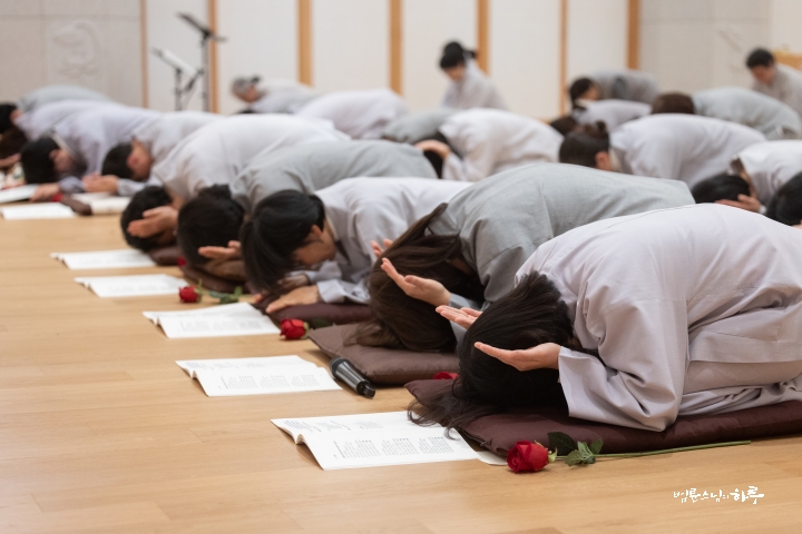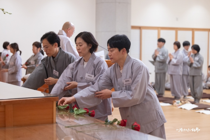 After completing the repentance and ritual stick ceremony, the assembly, now as Seowon Practitioners, promised to live a life of keeping the precepts purely. With joyful hearts, they approached the Buddha one by one to offer flowers, once again vowing to keep the precepts purely.