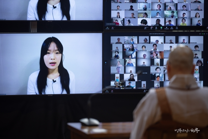 Without a moment’s rest, Sunim began an online Dharma Q&A session with Jungto Dharma School students at 10 o’clock. After about 2,000 students connected to the live broadcast, they recited the Three Refuges and Words for Practice, then watched a video of the students’ practice activities from last month.
