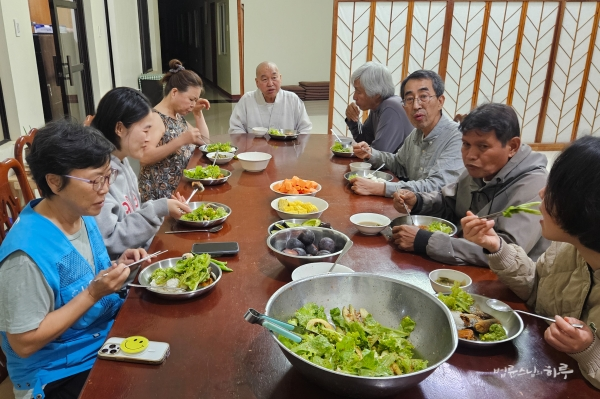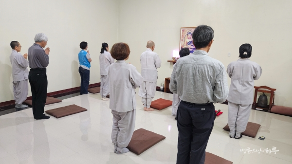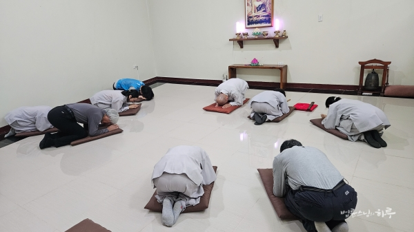 After personal time, they held evening prayers with JTS volunteers at 6 PM. After prayers, the JTS Philippines volunteers offered three bows to Sunim.