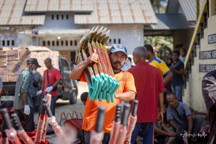 However, this support should not be the end. I saw you all gathering at the mosque to eat together. During Ramadan, you need to eat at home. That’s why it seemed each household needed a gas stove. I wanted to prepare dishes and kitchen utensils to distribute together this time, but we couldn’t suddenly prepare large quantities in this area where supplies are scarce. Today, we first prepared tools that can be used to clear soil from inside your homes.