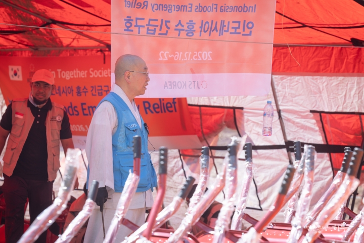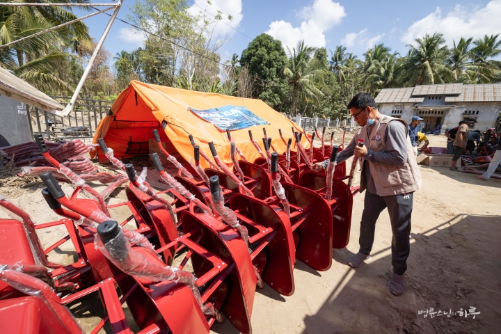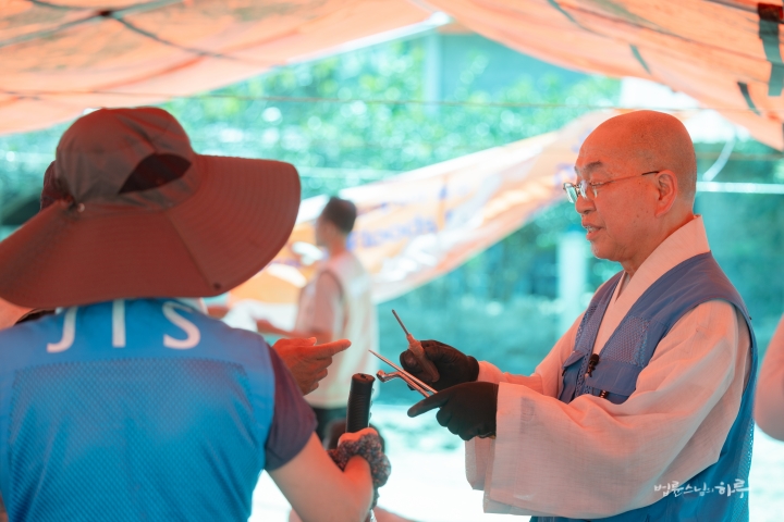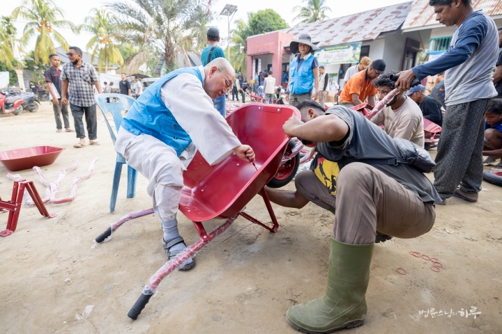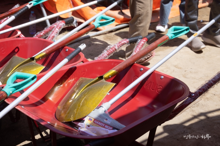 After exchanging greetings, Sunim first checked the preparation status of the relief supplies. Preparations were underway to distribute one set of five items – wheelbarrow, shovel, hoe, squeegee, and gloves – to each household.