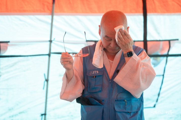 It was hot and humid weather with daytime temperatures rising to 31 degrees Celsius. The inside of the tent was almost like a sauna. Each time a wheelbarrow was completed, Sunim had to continuously wipe the sweat from his forehead.