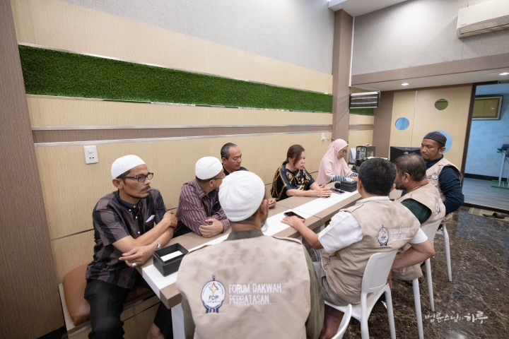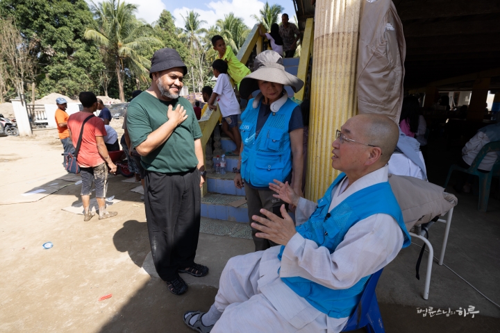Sunim took a breather after working non-stop with the residents. FDP representative Mr. Azar approached, placed his hand on his chest, and greeted him.