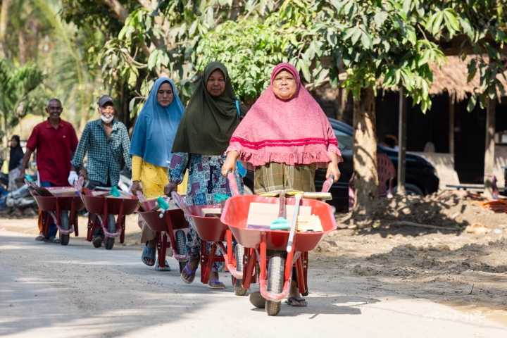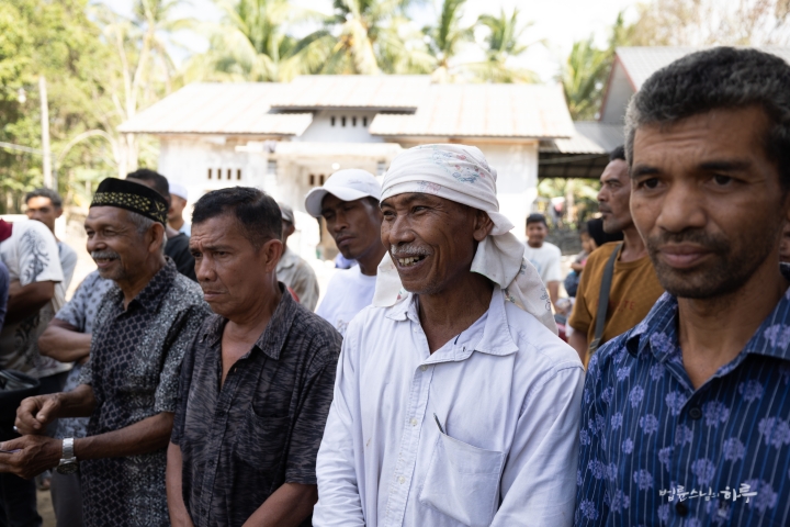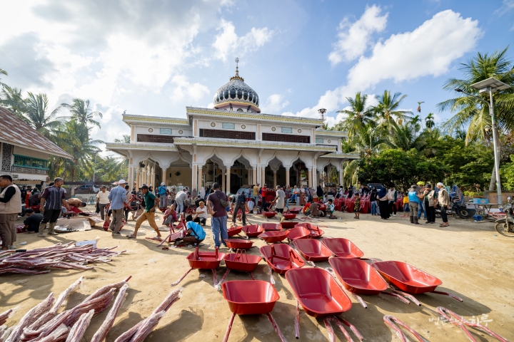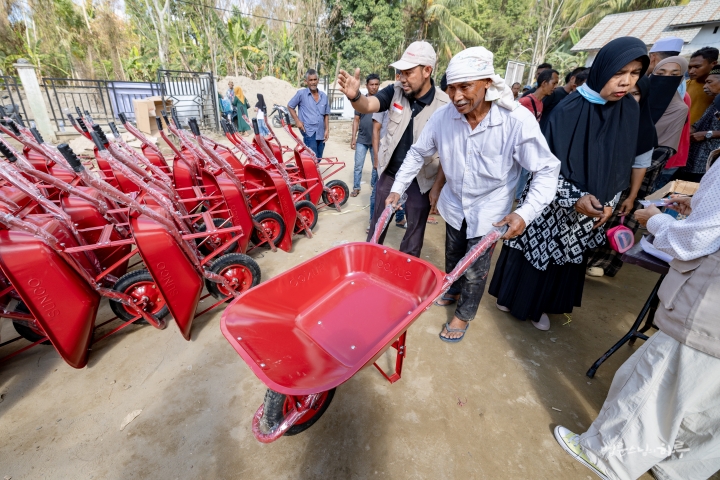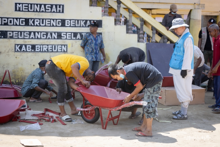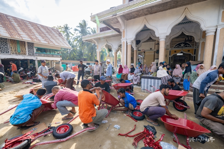 After a 20-minute drive, Sunim arrived at Kubu village at 4:00 PM. All the villagers had gathered at the mosque and were assembling wheelbarrows. This was a large village with 235 households, so there were many more wheelbarrows to assemble.