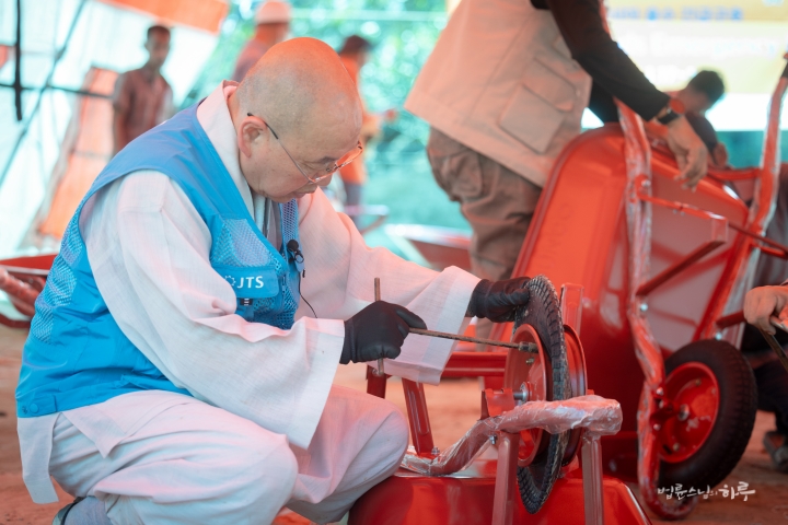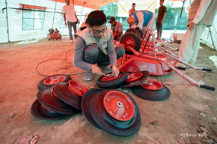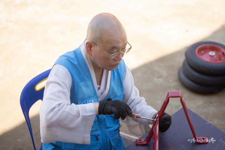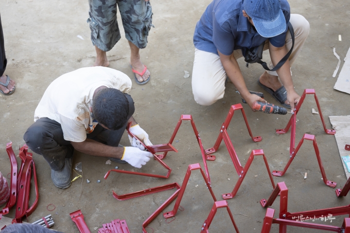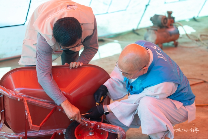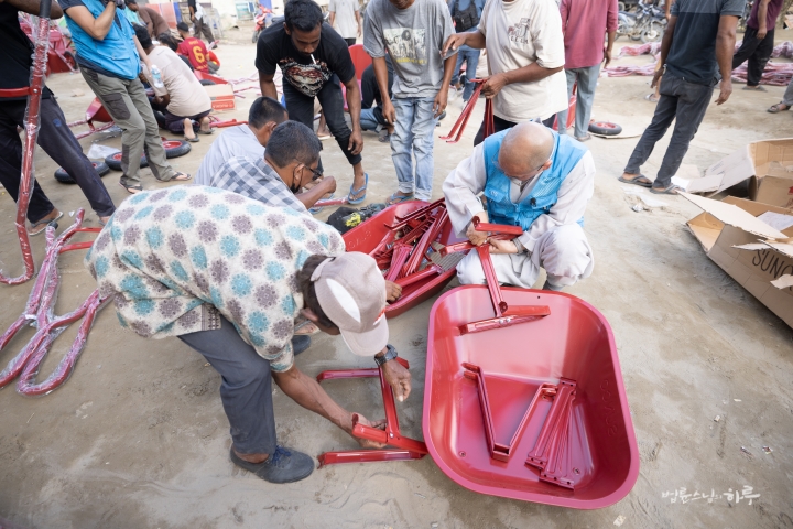 Sunim accepted the current situation and began assembling wheelbarrows with the village residents. The key was tightening the bolts and nuts. They repeatedly turned and tightened them while holding spanners that matched the nut sizes.