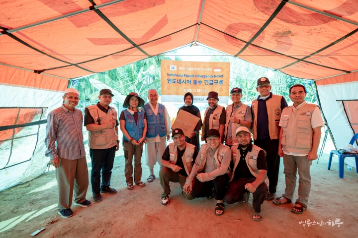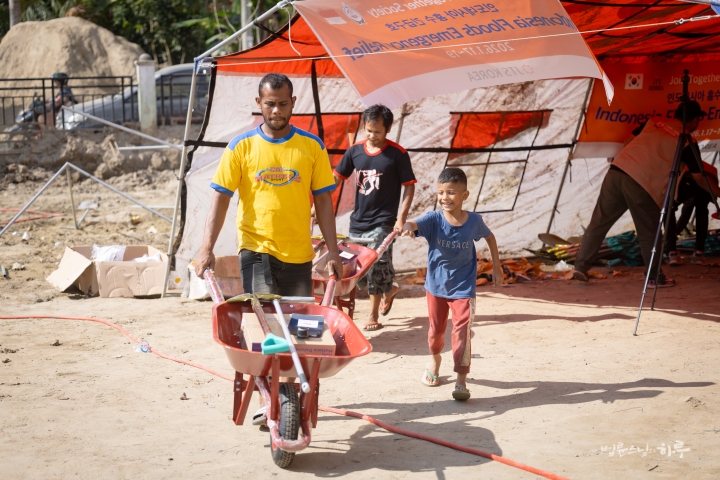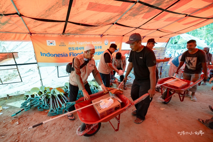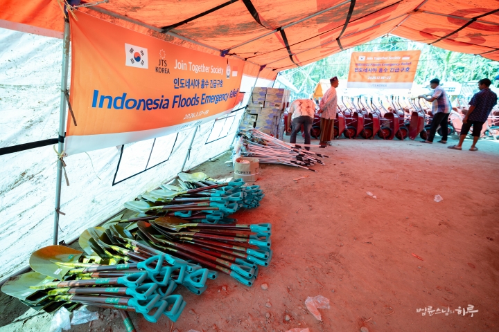 Hello. Today is the first day of distributing emergency relief supplies for the flood victims in Indonesia.