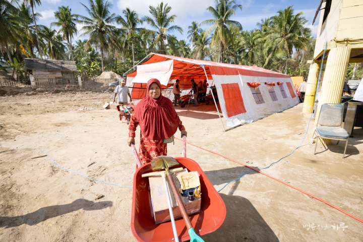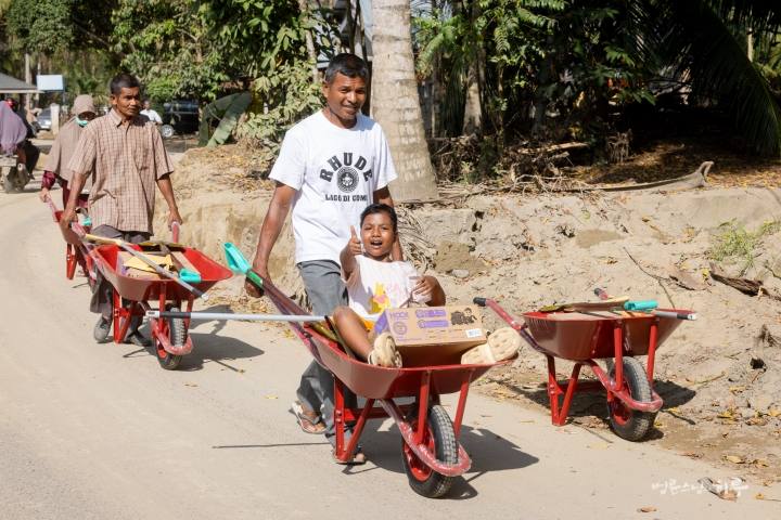 A father pulling a wheelbarrow with his daughter, a son pushing a cart alongside his mother, and a grandmother slowly moving a wheelbarrow with her granddaughter followed one after another. On that day, smiles bloomed on the faces of residents who had lost their homes after a long time.