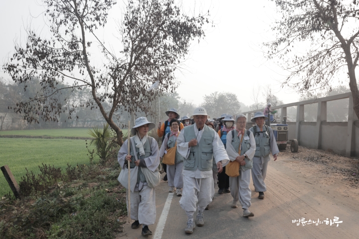 While walking, Sunim vividly described the story of teaching Uruvela Kassapa and Sujata’s offering in great detail. The pilgrimage group visited the site where the Buddha taught Uruvela Kassapa and the snake cave where the fire dragon was kept, then continued walking toward the Sujata Stupa.