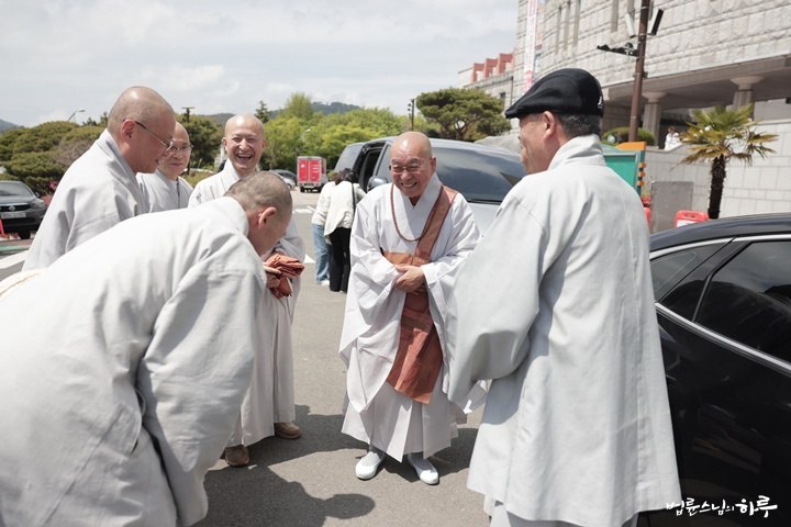 They barely managed to stop in front of the lecture hall. As Sunim got out, Venerable Yusu and monks from the Tongyeong Buddhist Temple Association came running from afar.